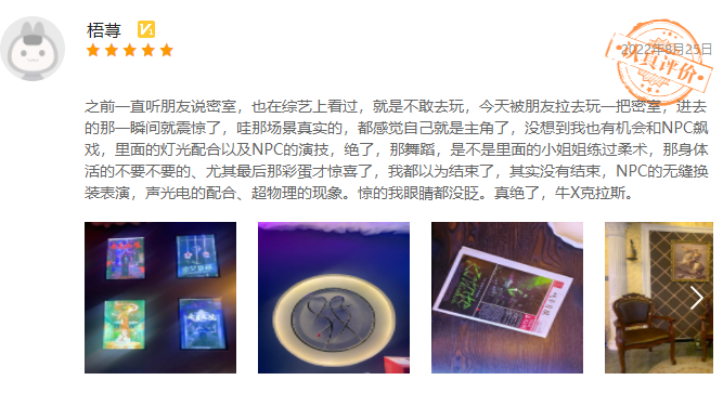 之前一直听朋友说密室,也在综艺上看过,就是不敢去玩,今天被朋友拉去玩一把密室,进去的那一瞬间就震惊了,哇那场景真实的,都感觉自己就是主角了,没想到我也有机会和NPC飙戏,里面的灯光配合以及NPC的演技,绝了,那舞蹈,是不是里面的小姐姐练过柔术,那身体活的不要不要的、尤其最后那彩蛋才惊喜了,我都以为结束了,其实没有结束,NPC的无缝换装表演,声光电的配合、超物理的现象。惊的我眼睛都没眨。真绝了,牛X克拉斯。
